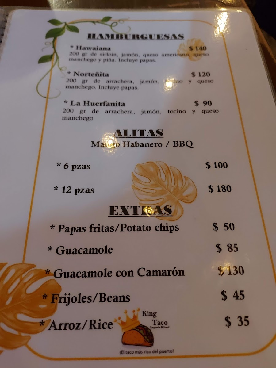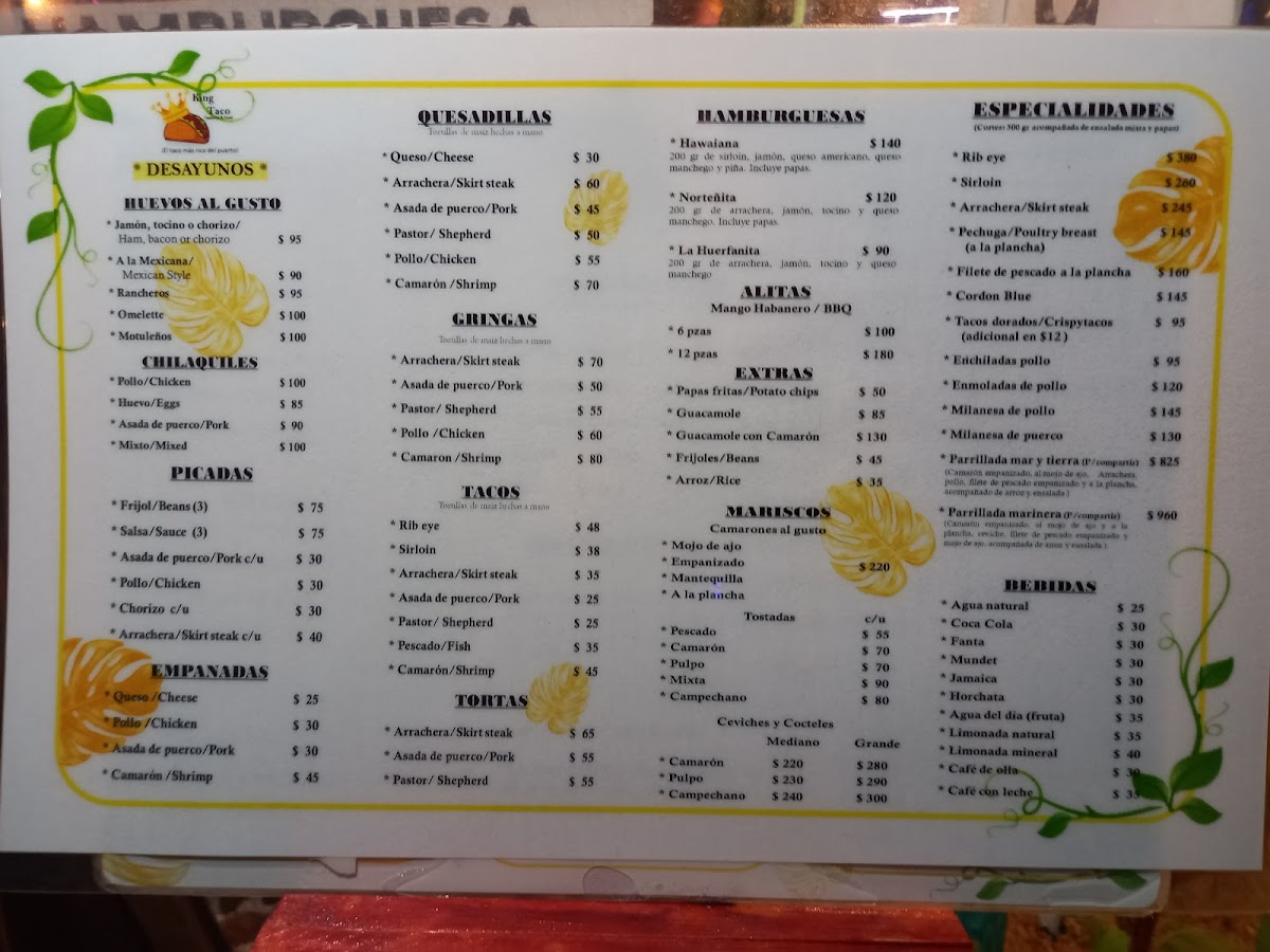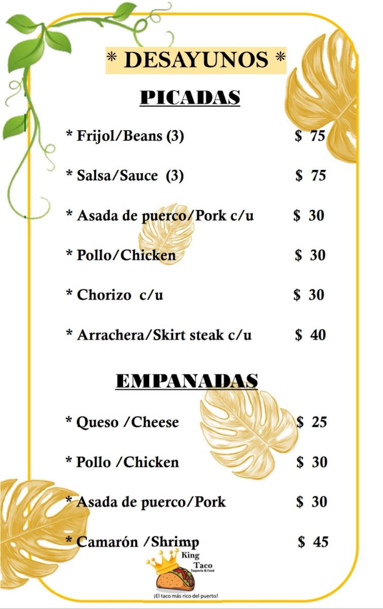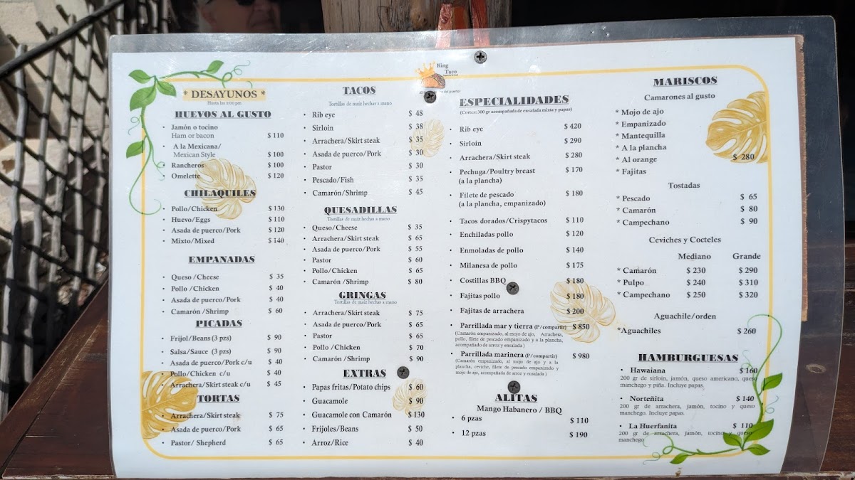Introducing the menu at King Taco, a delightful Mexican restaurant nestled in Puerto Morelos’ Mercado de Artesanos. This charming eatery has quickly become a local favorite, praised for its commitment to handmade cuisine and authentic flavors. From the first bite of their iconic tacos al pastor, which perfectly blend savory and sweet notes, to the satisfying crunch of tacos dorados, each dish is a celebration of Mexican culinary tradition.